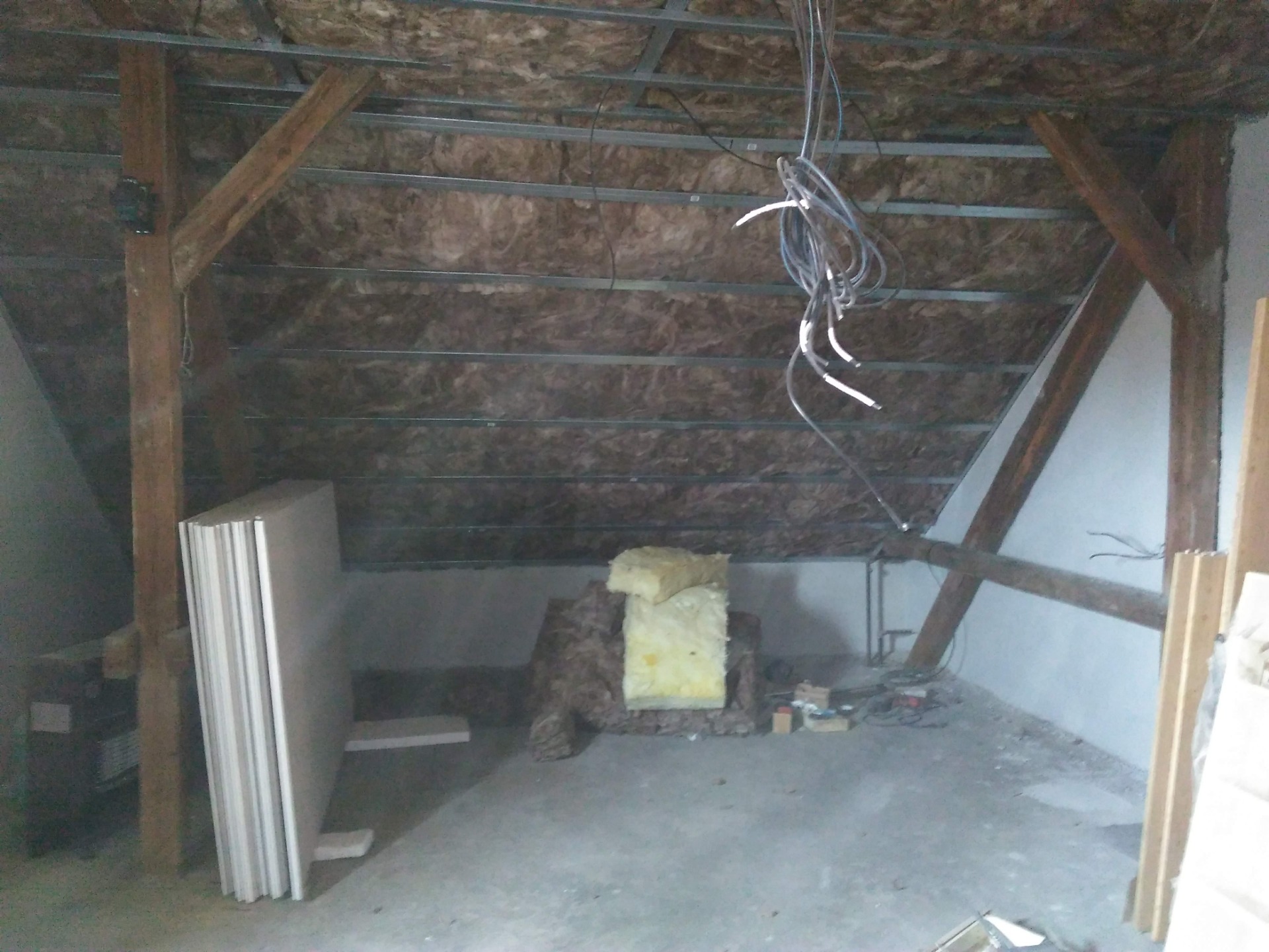 Půdní vestavba dvou pokojů v rodinném domě v Roštíně - tepelná izolace, hrubé omítky, štukové omítky, SDK podhledy, montáž oken (dveří), montáž SDK příček (včetně zárubní), opracování a rekonvalescence původního trámoví, pokládka podlahy.