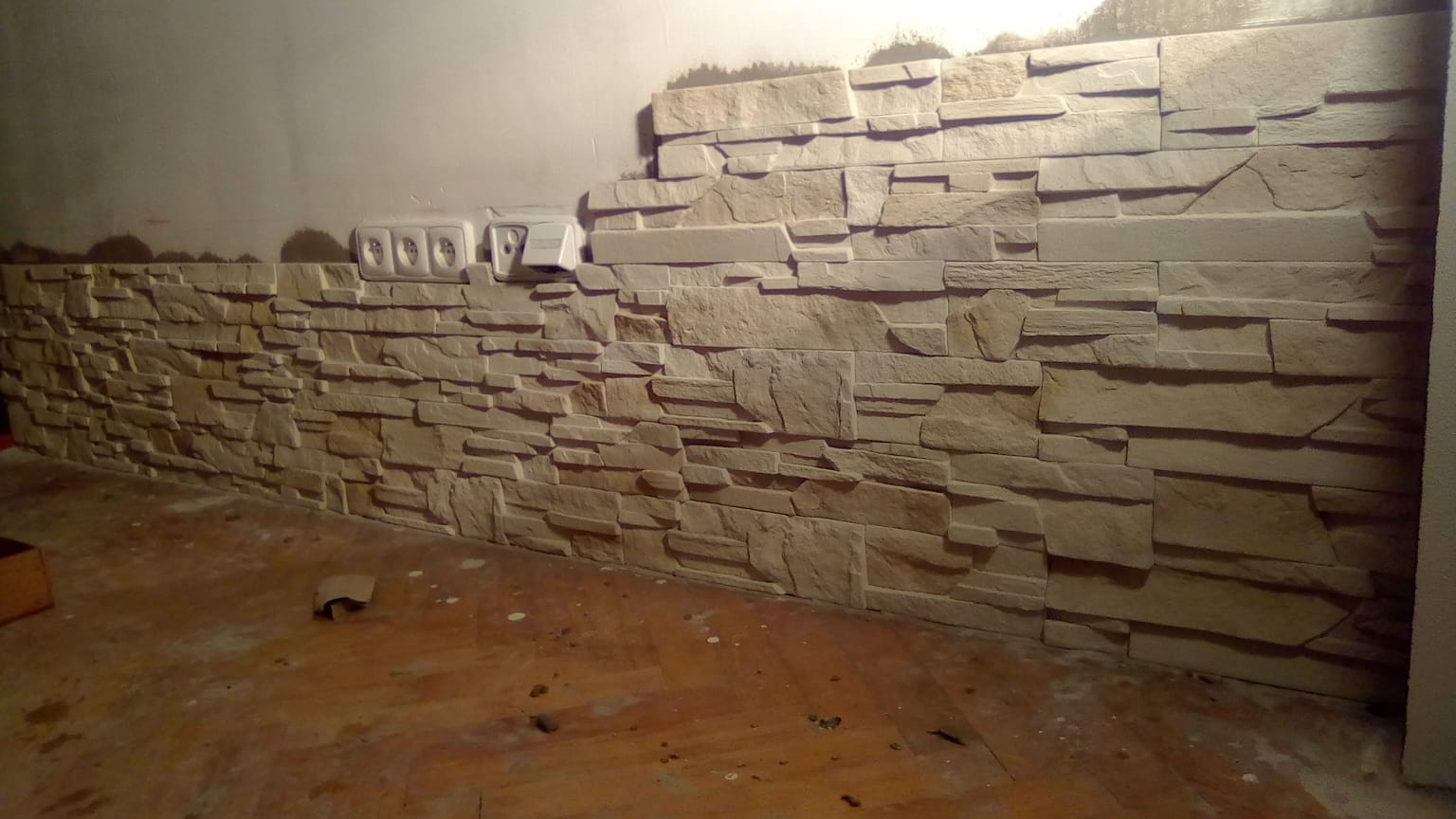 Kamenný obklad v obýváku - stěna za televizí + poličky.